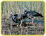 Cisne de cuello negro. (Cygnus melancorypha). Habita las lagunas del sistema y nidifica desde agosto a diciembre. El nido lo construye con juncos como una gran plataforma. Llevan los pichones sobre el lomo. |