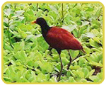 Jacana (Jacana jacana jacana) Áreas palustres con vegetación flotante. Reproduce de octubre a enero, deposita los huevos sobre la vegetación flotante (e.g. repollito de agua). |