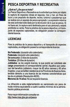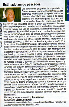 El Ministerio de Asuntos Agrarios a través de la Subsecretaría de Actividades Pesqueras y Desarrollo del Delta, a cargo de su Subsecretario: señor Oscar A. Fortunato ha puesto en marcha Proyectos para el desarrollo de la Pesca Deportiva, publicando material grafico y un pequeño libro de bolsillo con información considerada de interés para la inmensa cantidad de personas que disfrutan de esta actividad. |